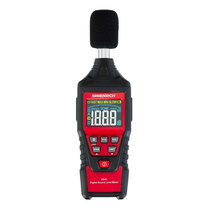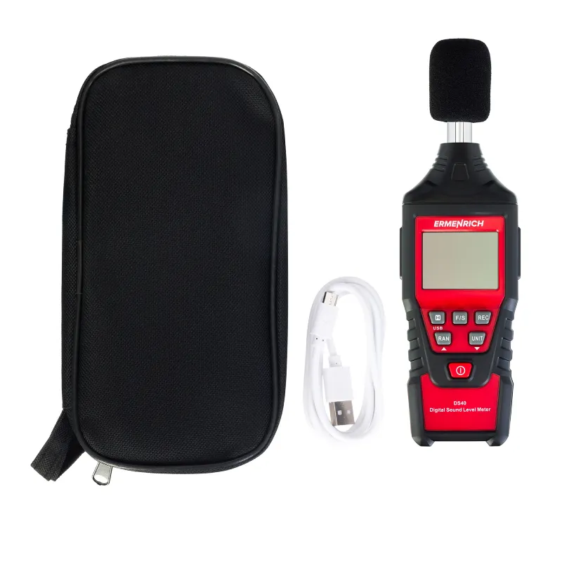 Шумомер Ermenrich Seek DS40- это современный прибор для замеров звука, который выдает точные результаты и позволяет обрабатывать и передавать данные. У него есть цветной экран, на котором удобно смотреть уровень шума. Через USB-порт можно перекинуть данные на компьютер.